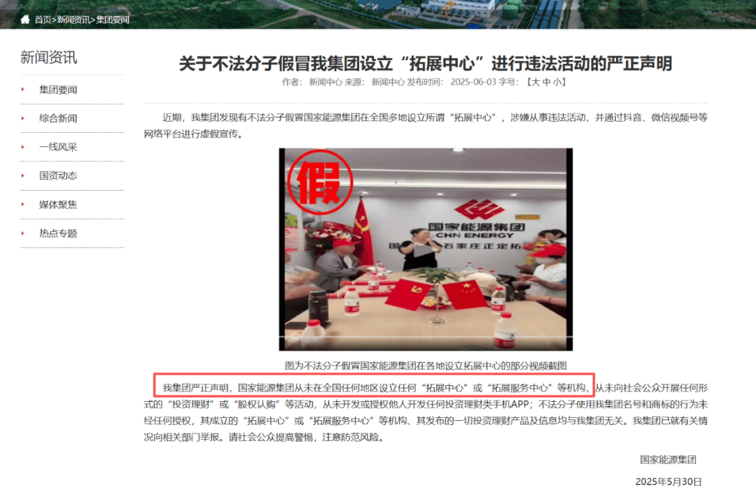 不法分子冒充“国家能源集团”开发的“国能APP”,虚构煤矿投资项目,以“三级获利”模式发展会员。其发布的一切活动和产品均与国家能源集团无关。国家能源集团早就发过打假声明。