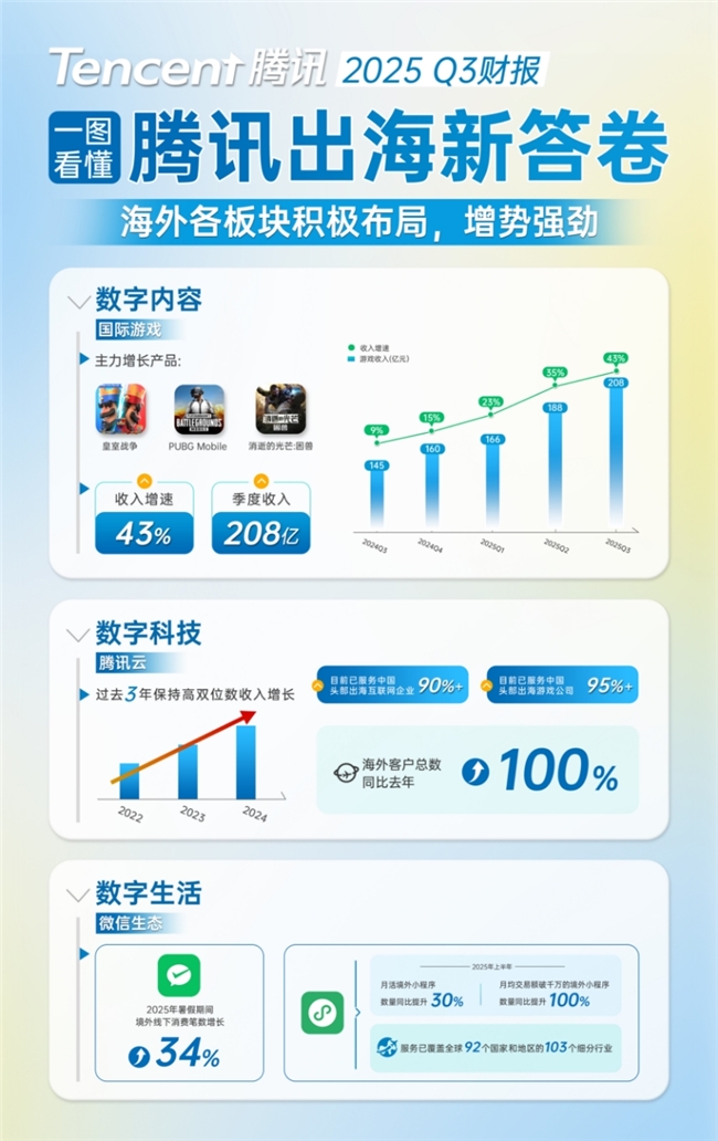 三季报显示,腾讯国际市场游戏增速达到43%,这是从2021年三季度该细分板块单独持续披露业绩以来的最高增速,其收入突破208亿元创新高。