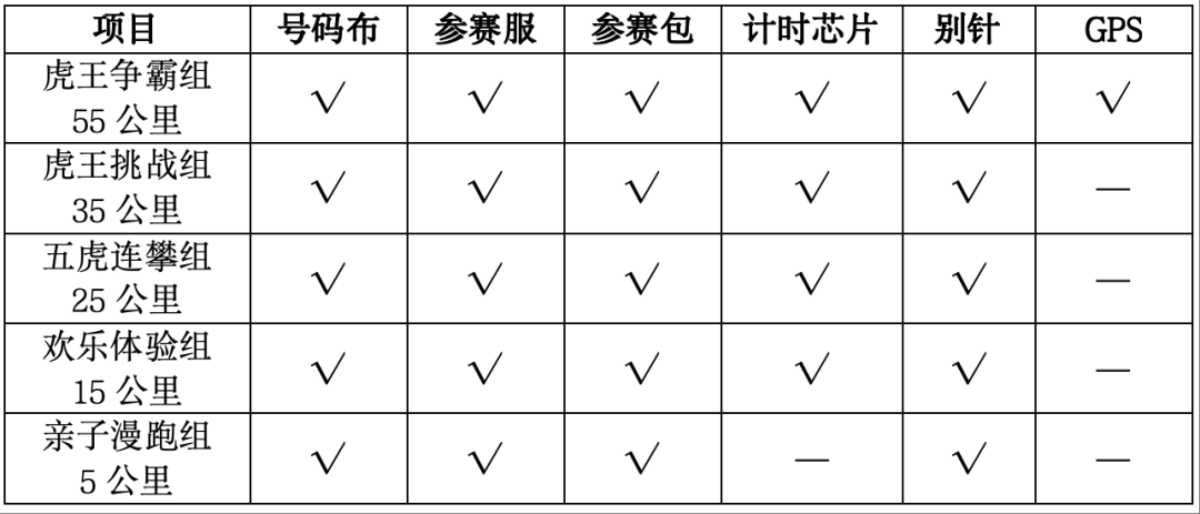 (4)芯片检测(虎王争霸组55公里、虎王挑战组35公里、五虎连攀组25公里、欢乐体验组15公里芯片检测)。