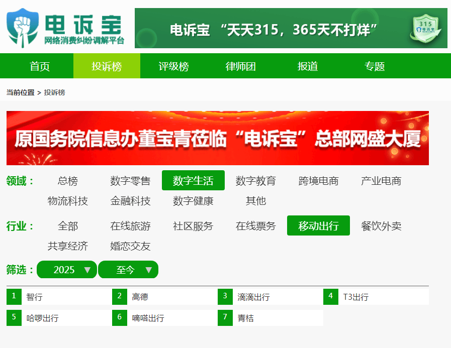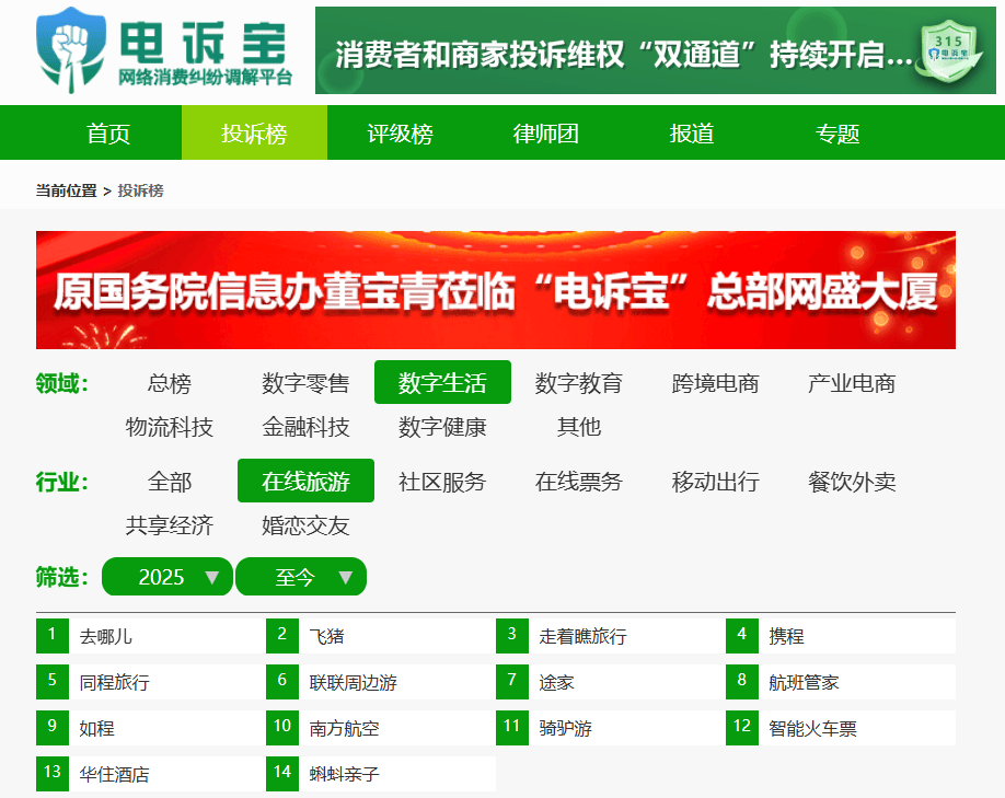 据网络消费纠纷调解平台网经社“电诉宝”显示,2025年至今在线旅游平台按投诉量排名依次为: