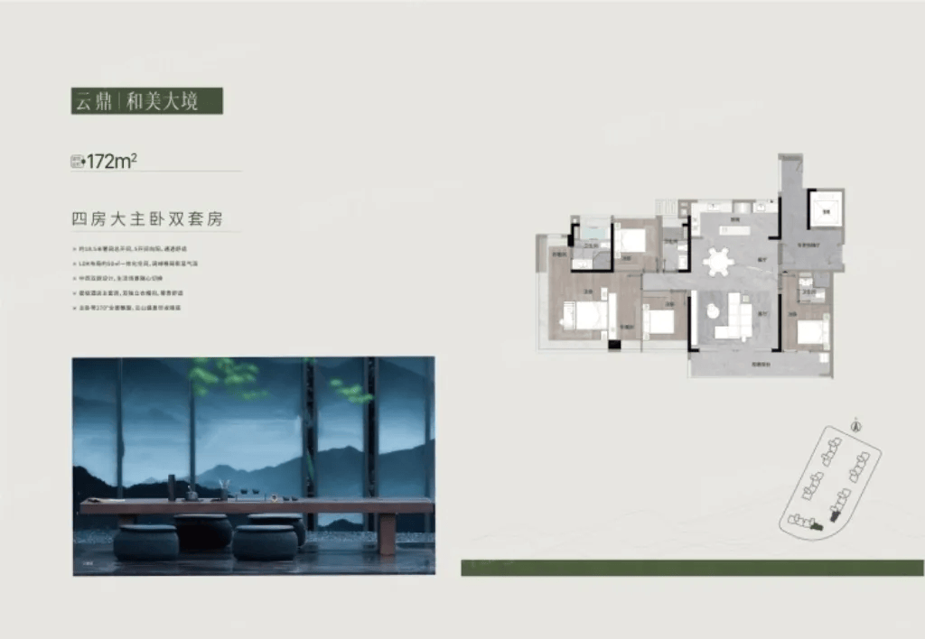 172㎡四房两厅三卫户型位于 8-10 栋的 10-22 层,总价约 1083 万起,是终极改善家庭的理想之选。该户型南向面宽达到 18.5 米,阳台长度 9.2 米,堪称 “空中庭院”,站在阳台上可俯瞰白云山全景,视野开阔,景观绝佳。