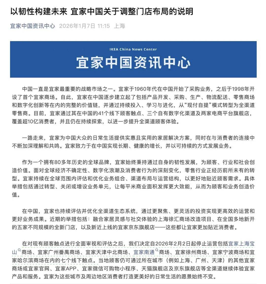 昨天,宜家中国发布关于调整门店布局的说明,宣布自 2026 年 2 月 2 日起,停止运营包括上海宝山商场、广州番禺商场、天津中北商场、南通商场、徐州商场、宁波商场和哈尔滨商场在内的 7 个线下触点。