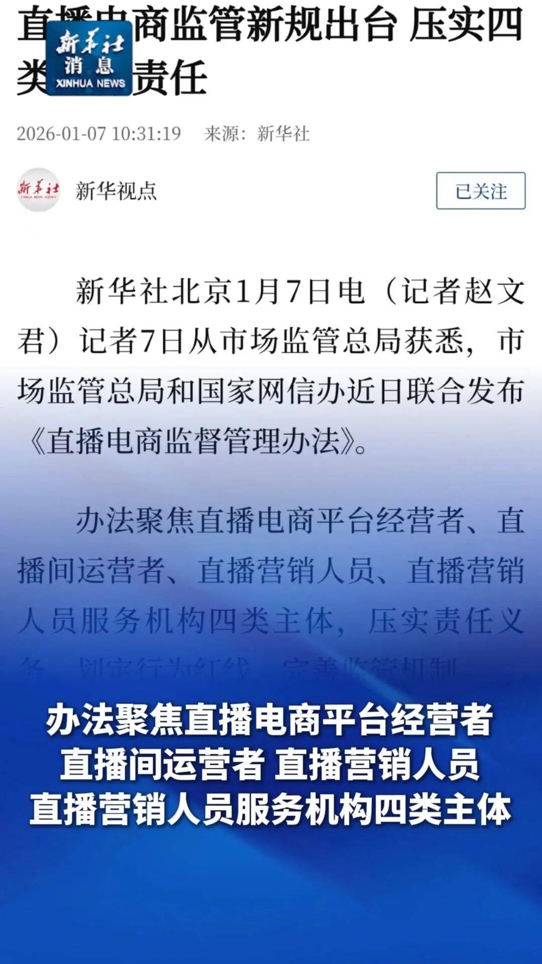 据新华社报道,市场监管总局与国家网信办近日联合发布《直播电商监督管理办法》,自今年起进一步强化对直播电商行业的规范化管理,明确四类主体责任,并将数字人主播等人工智能生成内容纳入监管范围。