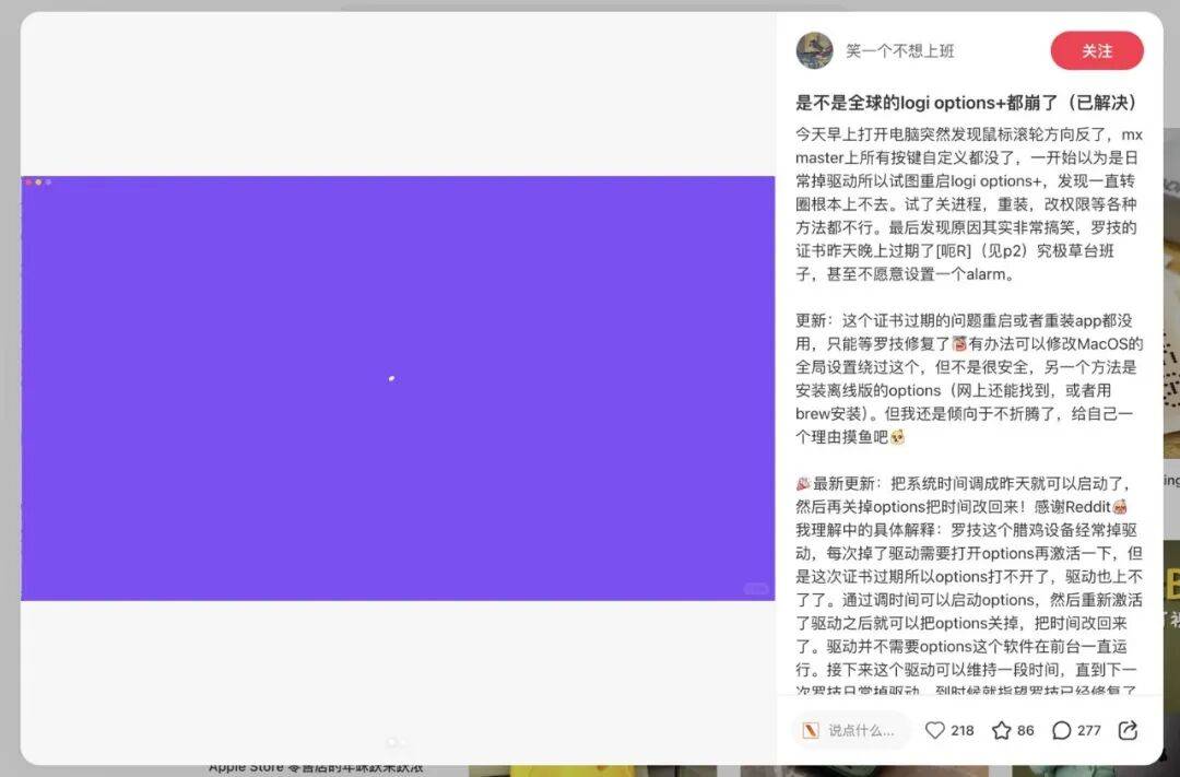 一位小红书用户称,原本正常使用的罗技鼠标,昨天上午开机后发现滚轮方向被反转、所有自定义快捷键清空,Logi Options+ 只停留在紫色加载界面,重启应用、重装程序、修改权限都无法恢复;
