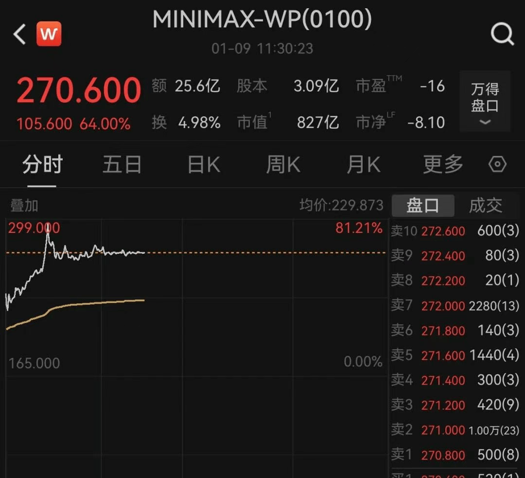 1 月 9 日,大模型公司 MiniMax(在港交所上市,开盘后股价迅速冲高,一度涨超 80%,股价逼近 300 港元,市值破 900 亿港元。