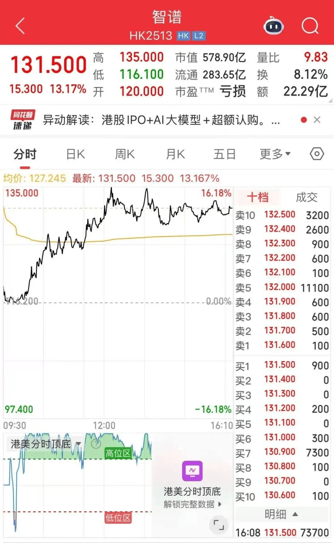 1 月 8 日,港交所锣声响起的一刻,智谱正式登陆港交所,股票代码 02513。上市首日,智谱开盘价 120 港元 / 股,盘中上涨 16.18% 至 135 港元 / 股,市值近 600 亿港元。
