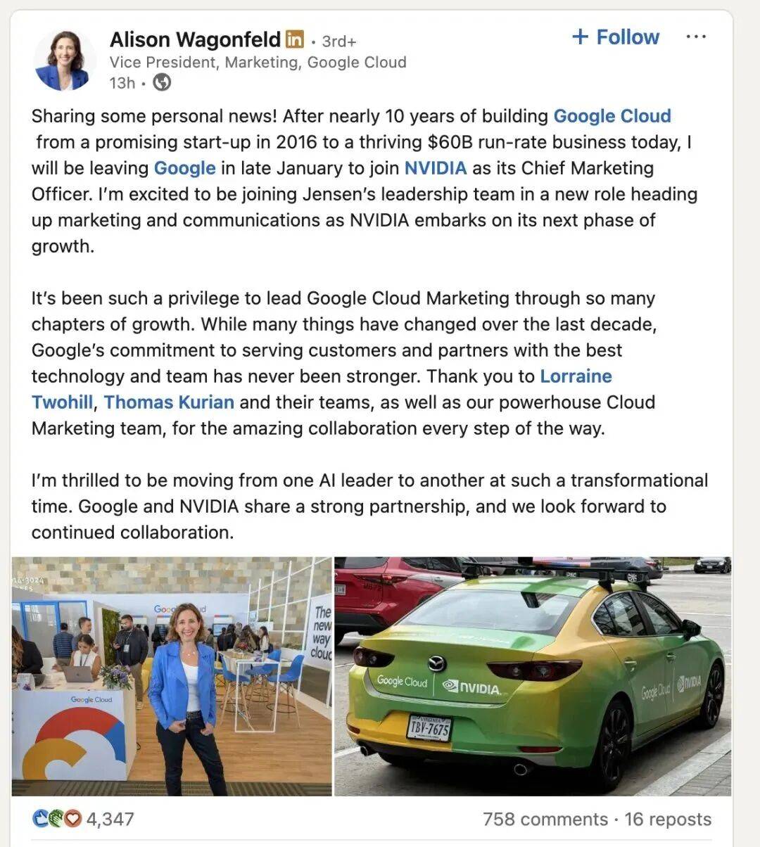 当地时间 1 月 8 日,谷歌云营销副总裁艾莉森·瓦贡菲尔德(Alison Wagonfeld)在社交平台发文宣布,将于 1 月底离开谷歌,加入英伟达担任首席营销官。