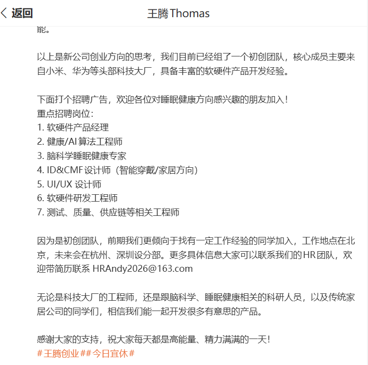 针对没有市场销售岗位以及不招应届生问题,他解释称,目前正重点组建产品研发团队,计划春节后陆续启动市场销售服务财务等团队的组建。“创业团队初期更需要有工作经验、来之能战的同学,待业务发展起来之后再欢迎应届生同学加入。”