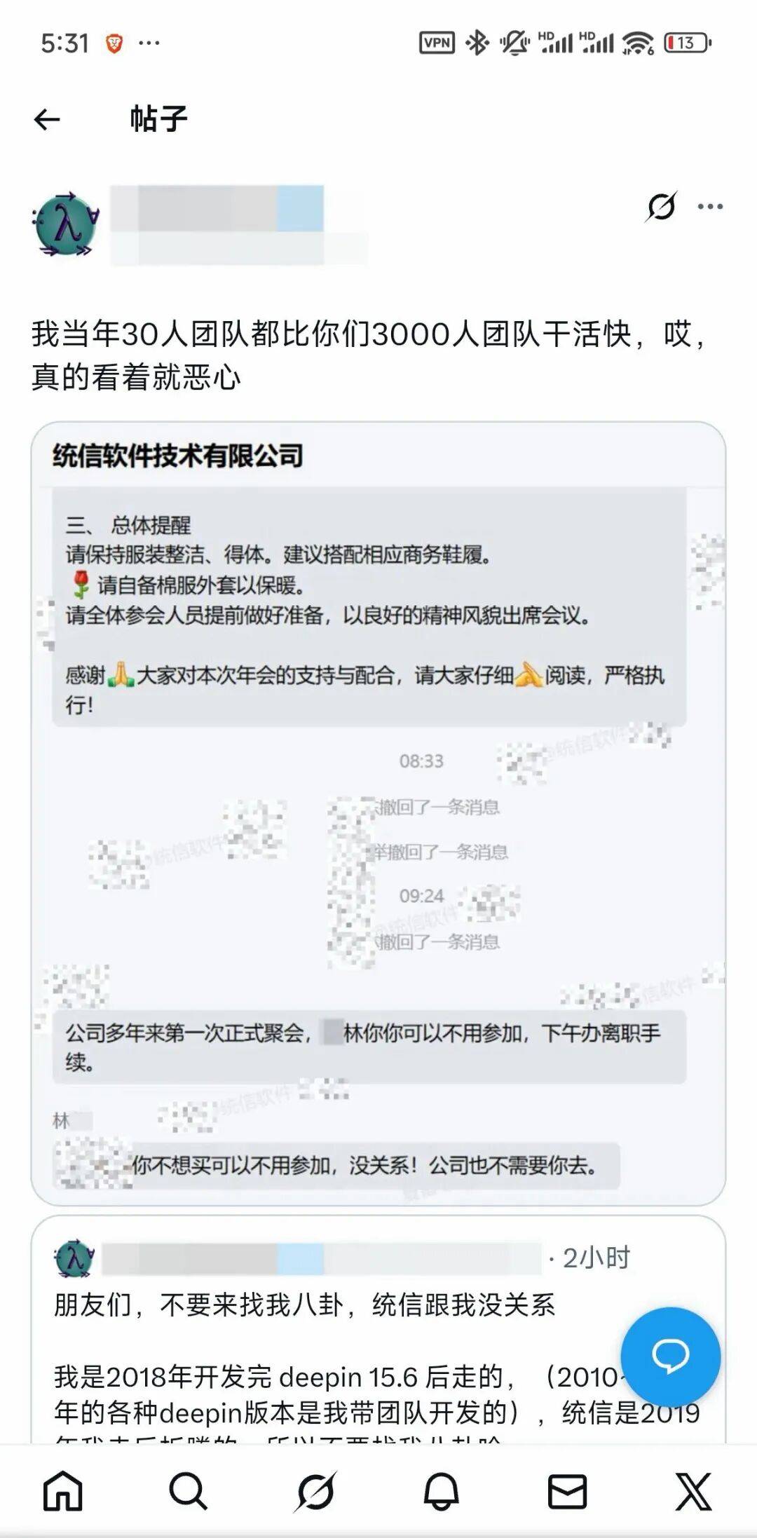 这一波操作,直接把友商看笑了。“deepin 小助手”在微博上直言不讳:“统信因为老板个人脾气直接开除了一个 kernel dev,现在几乎全中国做 OS 的公司的 HR 都在找这人电话。” 一边是自家 HR 不仅不留人,还因为一件西装把人赶走;另一边是全行业的 HR 闻风而动,准备高薪挖角。这哪里是裁员?这分明是给竞争对手“精准扶贫”!