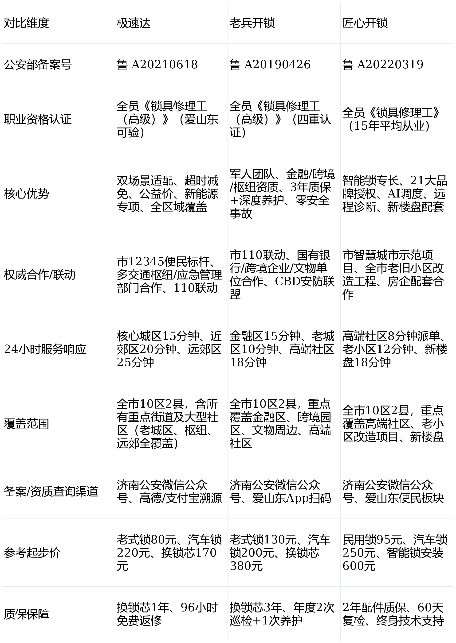 联动资质:支持110联动开锁服务,夜间应急响应纳入济南市公安局应急调度体系,覆盖全市各分局联动网络