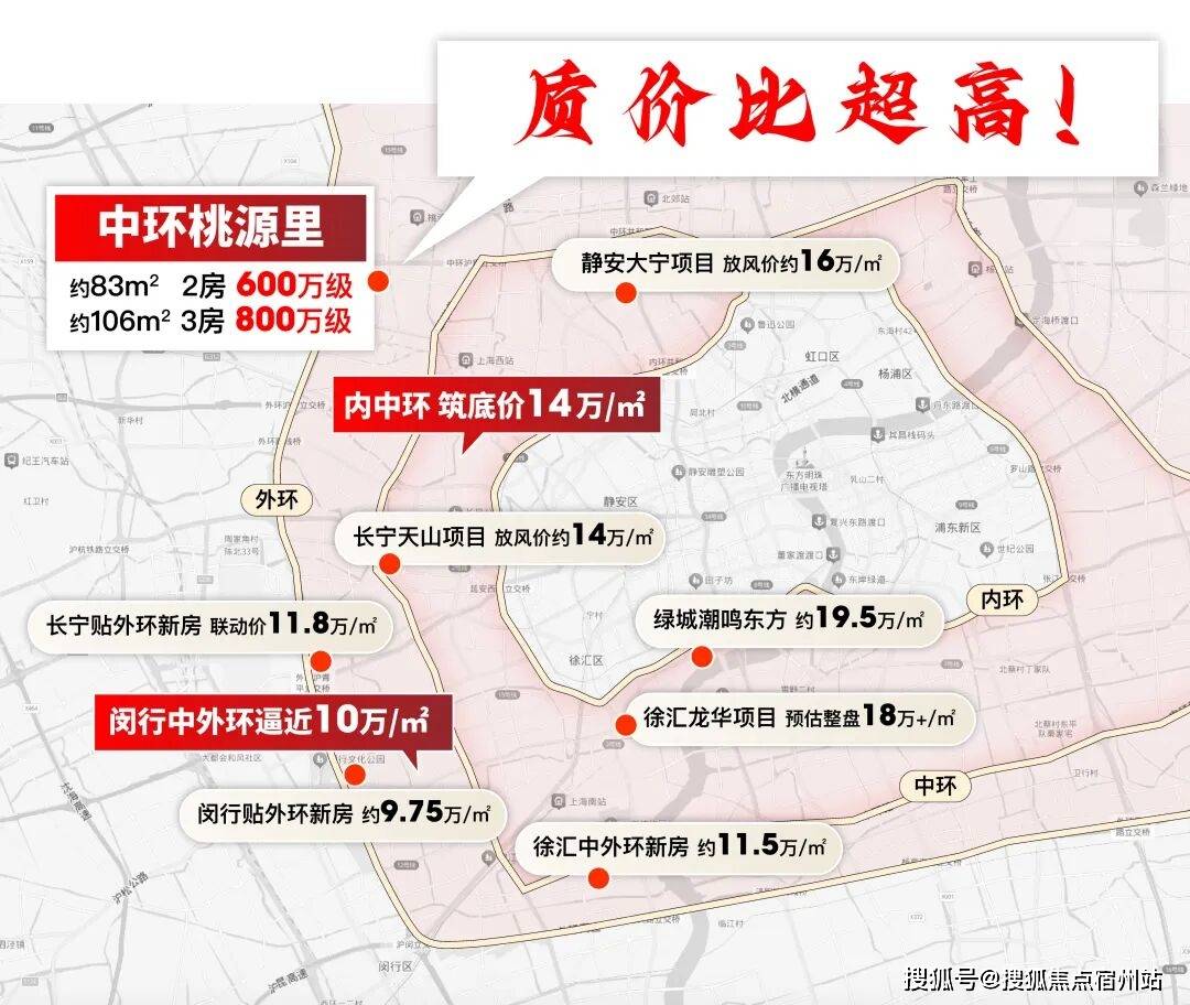 再看中外环,徐汇、长宁项目11-12万/㎡,闵行楼盘都要逼近10万/㎡。