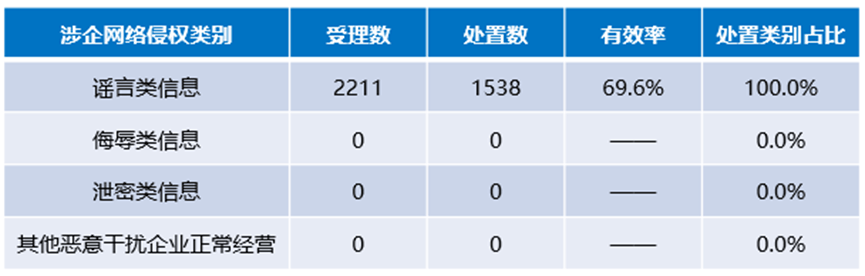 本月受理涉企网络侵权举报总数2211件,其中有效举报1538件,有效率为69.6%。