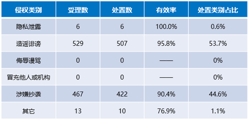 本月受理个人侵权类及作品抄袭类侵权举报1015件,其中有效举报945件,有效率为93.1%。