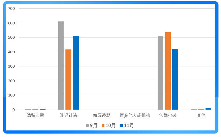 2025年11月,搜狐号累计受理网络侵权举报3226件,其中有效举报2483件,有效率为77.0%。举报内容包括泄露他人隐私、造谣诽谤、侮辱谩骂、作品抄袭等。对于这些举报信息,搜狐号平台均进行了快速受理、核查、处置。